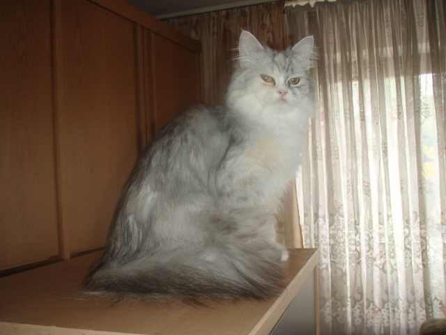 Flauschiges Fell in hellgrau, weiß, creme, honigfarbene Augen.